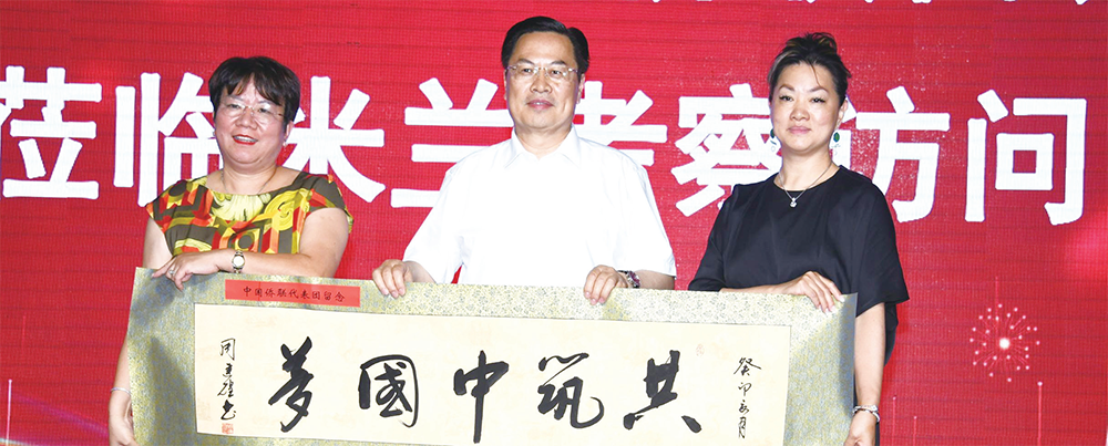 胡月燕会长(左)、余小叶会长(右)代表米兰侨界向程学源副主席赠送纪念品。
