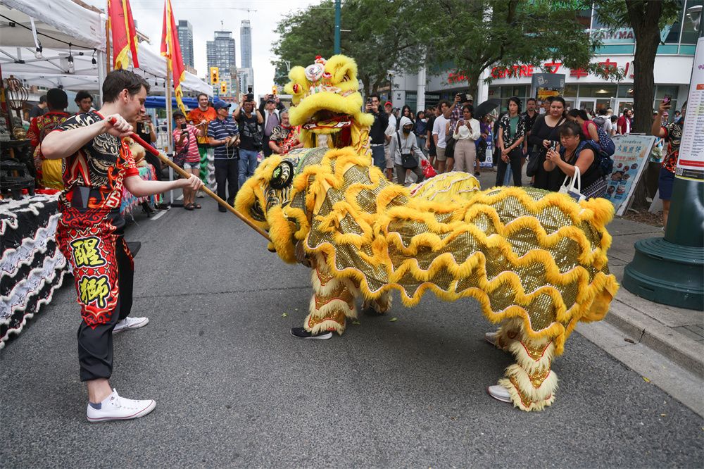 当地时间8月17日,加拿大多伦多,在第24届多伦多中区华埠同乐日活动中,醒狮采青表演吸引游人驻足。(图片来源:中新社)