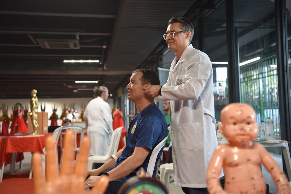 当地时间8月18日,巴西圣保罗,巴西中医学院的“洋中医”在“庆祝巴西和中国建交50周年暨巴西中国移民节”活动上展示中医诊疗技术。