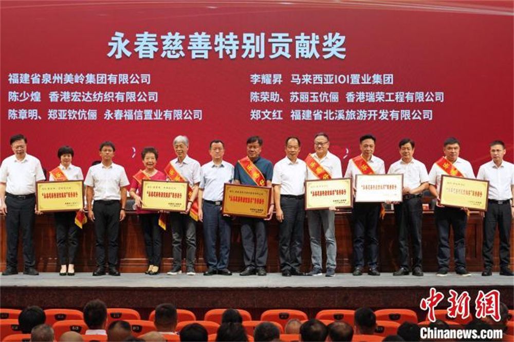 其间,大会授予福建省泉州美岭集团有限公司等6家单位、个人“永春慈善特别贡献奖”、汤志强等6位“永春慈善家”、郑志光兄弟等21位“永春慈善大使”、陈春草等97位“永春慈善市民”、福建省永春第一中学董事会等51个“永春慈善单位(企业、组织、机构)”,并现场为部分代表颁发牌匾。
