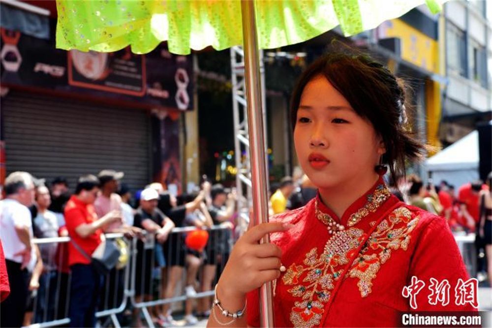 当地时间9月14日,巴西圣保罗25街,中秋嘉年华活动上进行妈祖信俗文化阵头表演的华人少女。