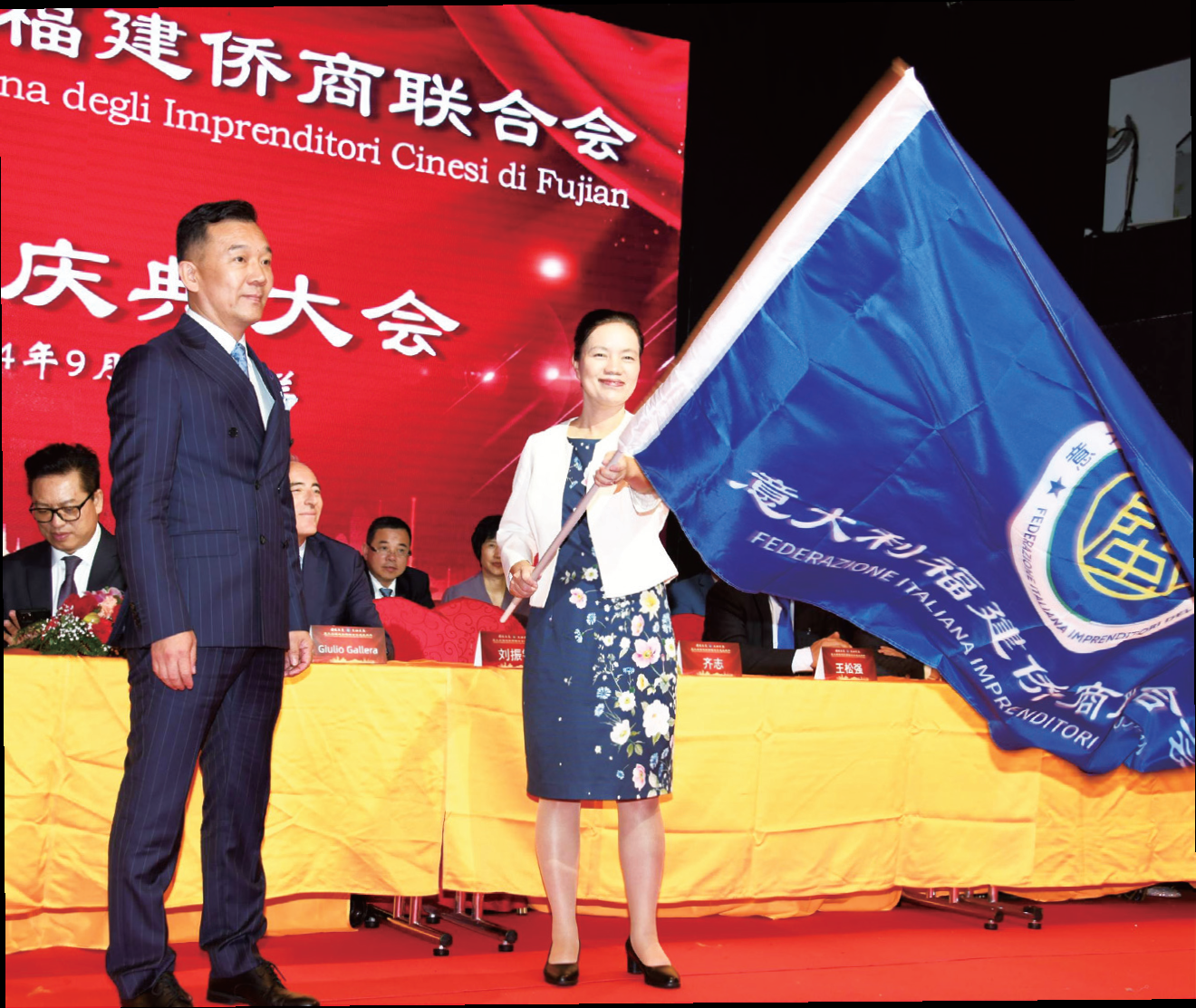 齐志(右)将意大利福建侨商联合会会旗亲手交到刘振钢(左)手中。(图片来源:本文图片均由欧洲时报记者夏晓彤摄)