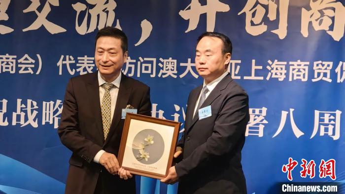 当地时间9月20日,澳大利亚上海商贸促进会(简称上海会)与来访的上海市工商联(总商会)代表团在墨尔本举行了一场商务座谈会。图为上海市工商联(总商会)向澳大利亚上海商贸促进会(上海会)赠送纪念品。