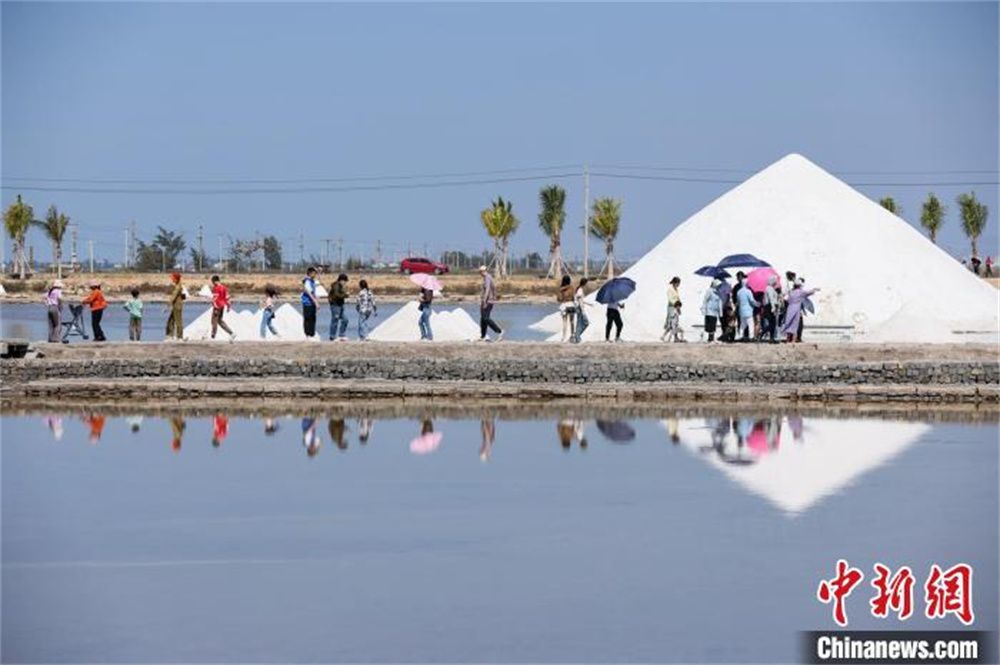 资料图为2024年2月14日,游客在海南莺歌海盐场打卡拍照。(图片来源:中新网)