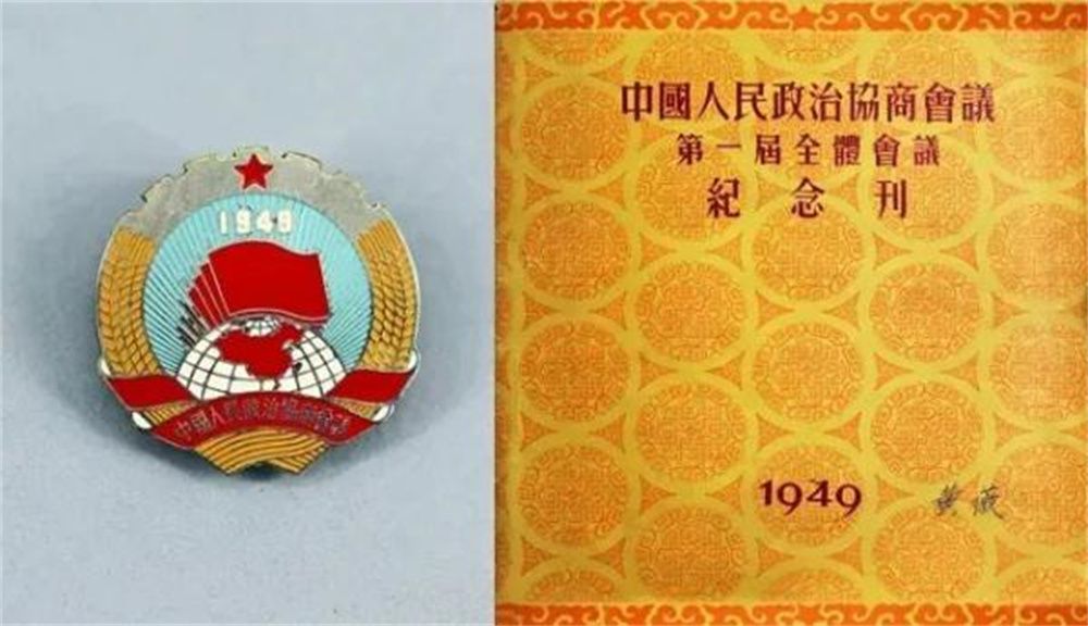 1949年9月,马来亚归侨黄薇参加中国人民政治协商会议时佩戴的会徽和珍藏的《中国人民政治协商会议第一届全体会议纪念刊》。(中国华侨历史博物馆供图)