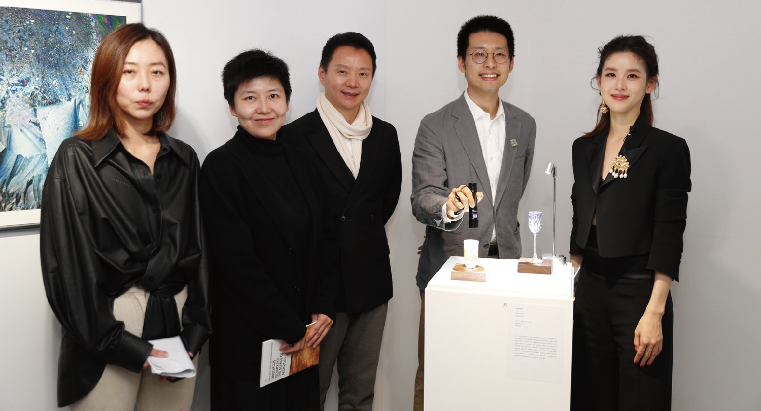 (左起)艺术展出品人章泽天,参展艺术家代表李瀛龙、沈伟,总策划、全英清华校友会副会长兼秘书长高远,主策展人赵彤,在展览上合影。(图片来源:主办方供图)
