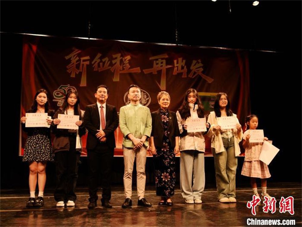 唐韵艺术团团长林筠(右四)和中外嘉宾在巴西唐韵艺术团25周年庆典上为优秀获奖学员颁奖。
