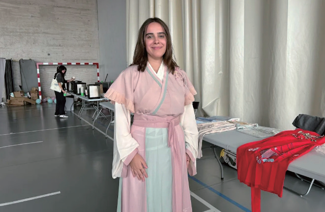 现场参赛选手试穿汉服,体验中国文化。