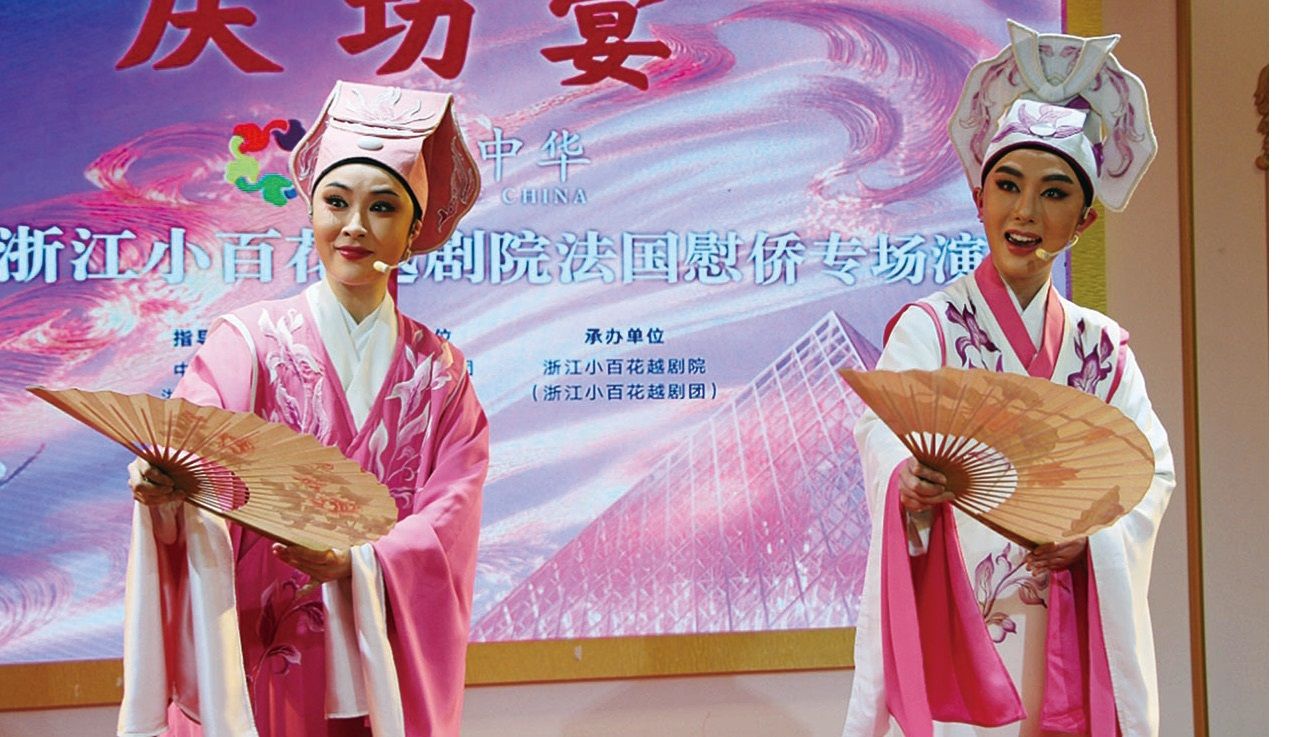 【欧洲时报记者黄冠杰巴黎报道】10月25日晚,旅法浙江籍侨团假座巴黎大酒楼与“逾越千万里”浙江小百花越剧院法国巡演团举行联欢活动,祝贺剧团法国巡演活动取得圆满成功。中国驻法使馆领侨处万磊参赞、白鸽秘书,欧洲时报文化传媒集团总裁、欧洲时报社社长钟诚应邀出席活动。浙江小百花越剧团吴维益副团长率领巡演团的成员出席了联欢活动。法国华侨华人会主席蔡君柱、法国青田同乡会会长周伟、法国华侨华人会妇女联合会会长陈岚等旅法社团侨领及各侨团代表近300人参加联欢活动。