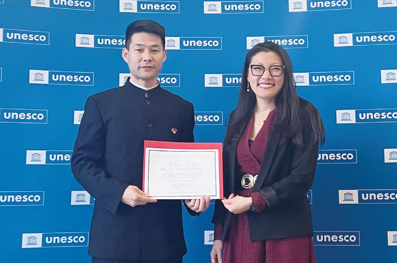 当天,在联合国教科文组织巴黎总部,文化部门执行办公室主任多琳·杜布瓦(Dorine DUBOIS)向李灵成颁发了荣誉证书,该证书由联合国教科文组织文化助理总干事埃尔乃斯托·奥托内·拉米雷斯(Ernesto Ottone Ramirez)签署。