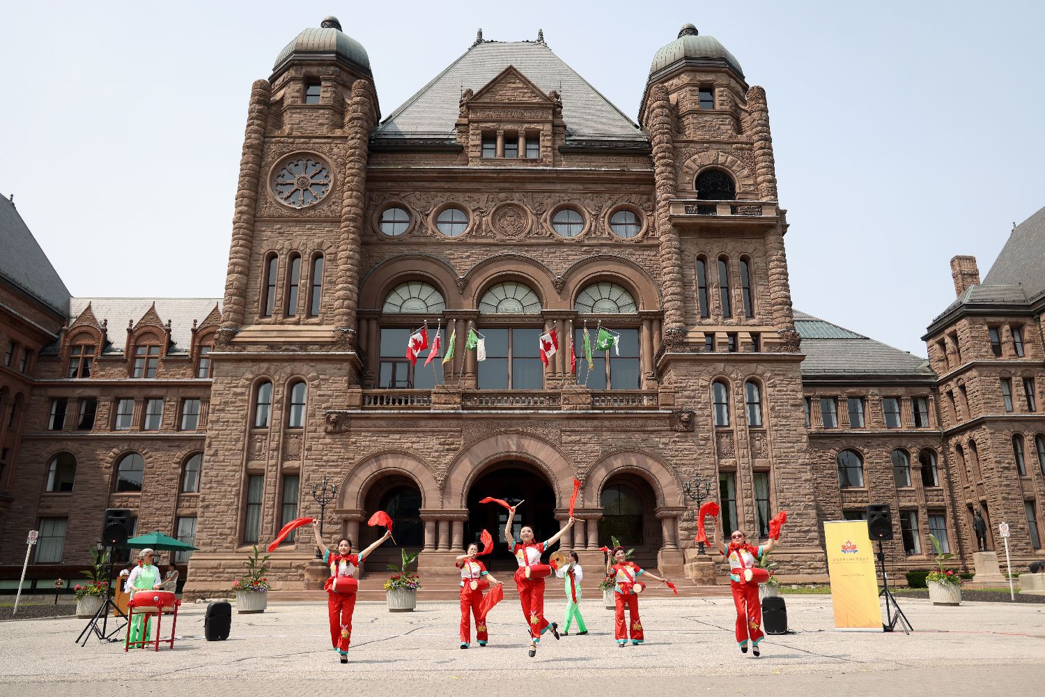 2023年5月21日,华人文艺团体的演员们在位于多伦多的加拿大安大略省省议会大楼前表演腰鼓舞。多伦多华人团体联合总会当日在此主办以促进多元文化发展、反对种族歧视为主旨的加拿大亚裔传统月庆祝活动。(图片来源:中新社)