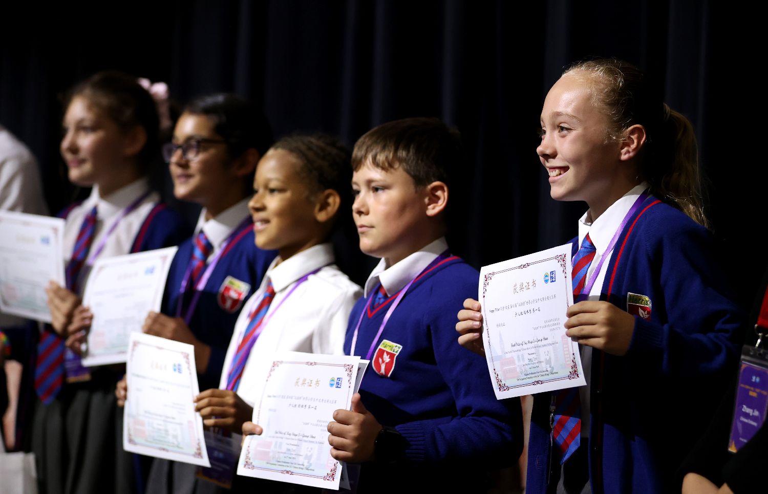 2024英国中小学生“汉语桥”中文比赛颁奖典礼9月20日在伦敦举行,为不同年龄段和不同级别的选手颁发了包括“最富创意奖”等在内的近30个个人、团体奖项。图为获得少儿组团体秀第一名的学生们在颁奖仪式上展示获奖证书。(图片来源:新华社)