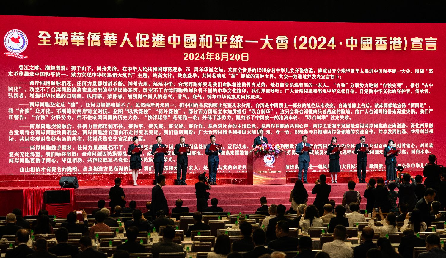 8月20日,全球华侨华人促进中国和平统一大会(2024·中国香港)在香港会议展览中心举行。图为青年代表宣读《全球华侨华人促进中国和平统一大会(2024·中国香港)宣言》。(图片来源:中新社)