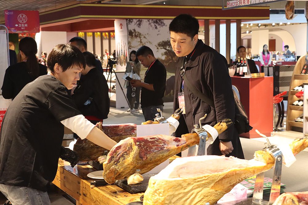 11月15日,第六届华侨进口商品博览会暨青田进口葡萄酒交易会、第四届国际咖啡博览会(简称:侨博会)在浙江青田开幕,1700名海内外参展商相聚侨乡推荐特色产品。图为当日,参展商为顾客推荐西班牙火腿。(图片来源:中新社)