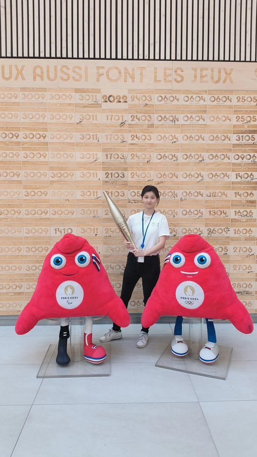 在申请志愿者之前,邵爱伦作为法兰西岛大区青年议会议员,就经常从年轻人的角度对就业、教育、文体等领域的社会事务给大区提出意见和建议,以报告形式呈送给法兰西岛大区议会提供参考。图为邵爱伦与火炬吉祥物合影。(图片来源:受访者供图)