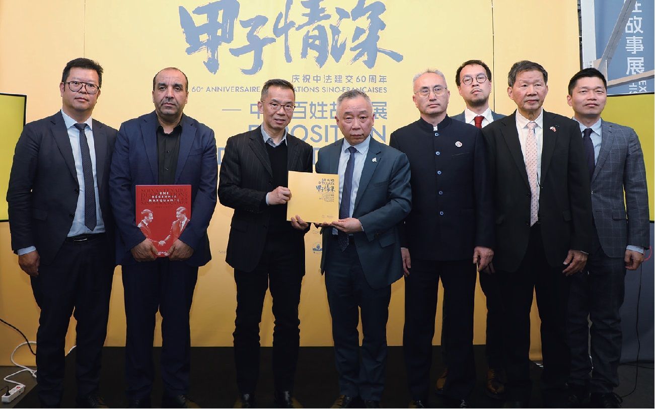 时任中国驻法国大使卢沙野接受欧洲时报社长钟诚赠送的展览作品集并与部分侨领及中资机构负责人合影。左2为让第伊市长持钟诚社长赠送的由欧时出版的纪念中法建交60年法文画册。(图片来源:欧洲时报记者黄冠杰摄)