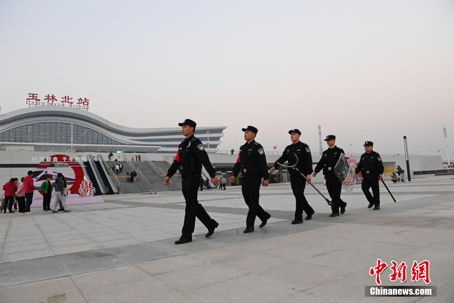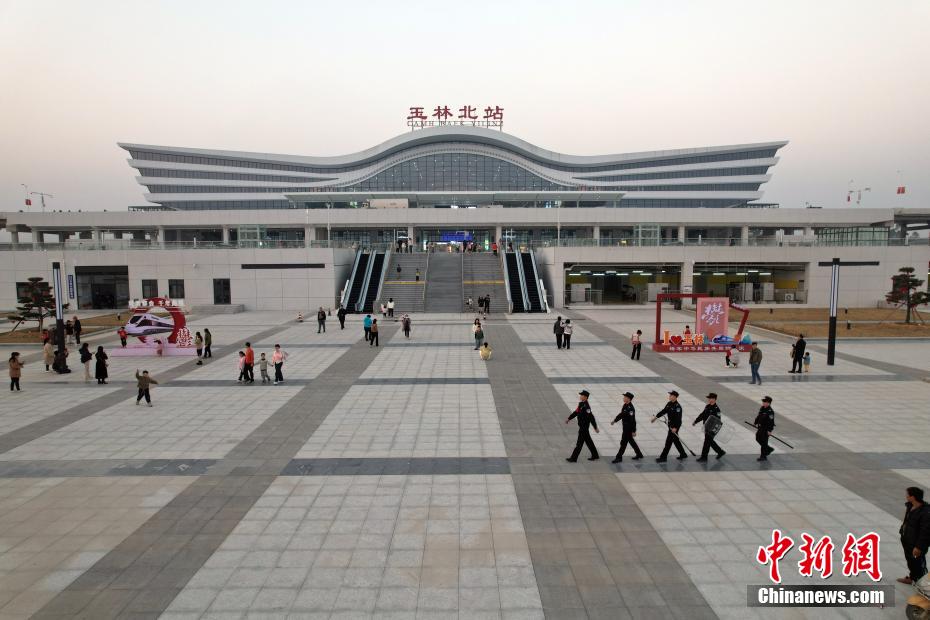 玉林有着岭南都会的美誉,玉林北站正立面幕墙上方是一圈象征岭南建筑山墙的瓦当图案,表现的是五行墙中元素“金”的形象,在山墙的顶上有玉林北站四字题名,结合玉林八景挂榜山的典故,有“题名山头,人文荟萃”的寓意。图为航拍铁路民警在玉林北站广场巡逻。