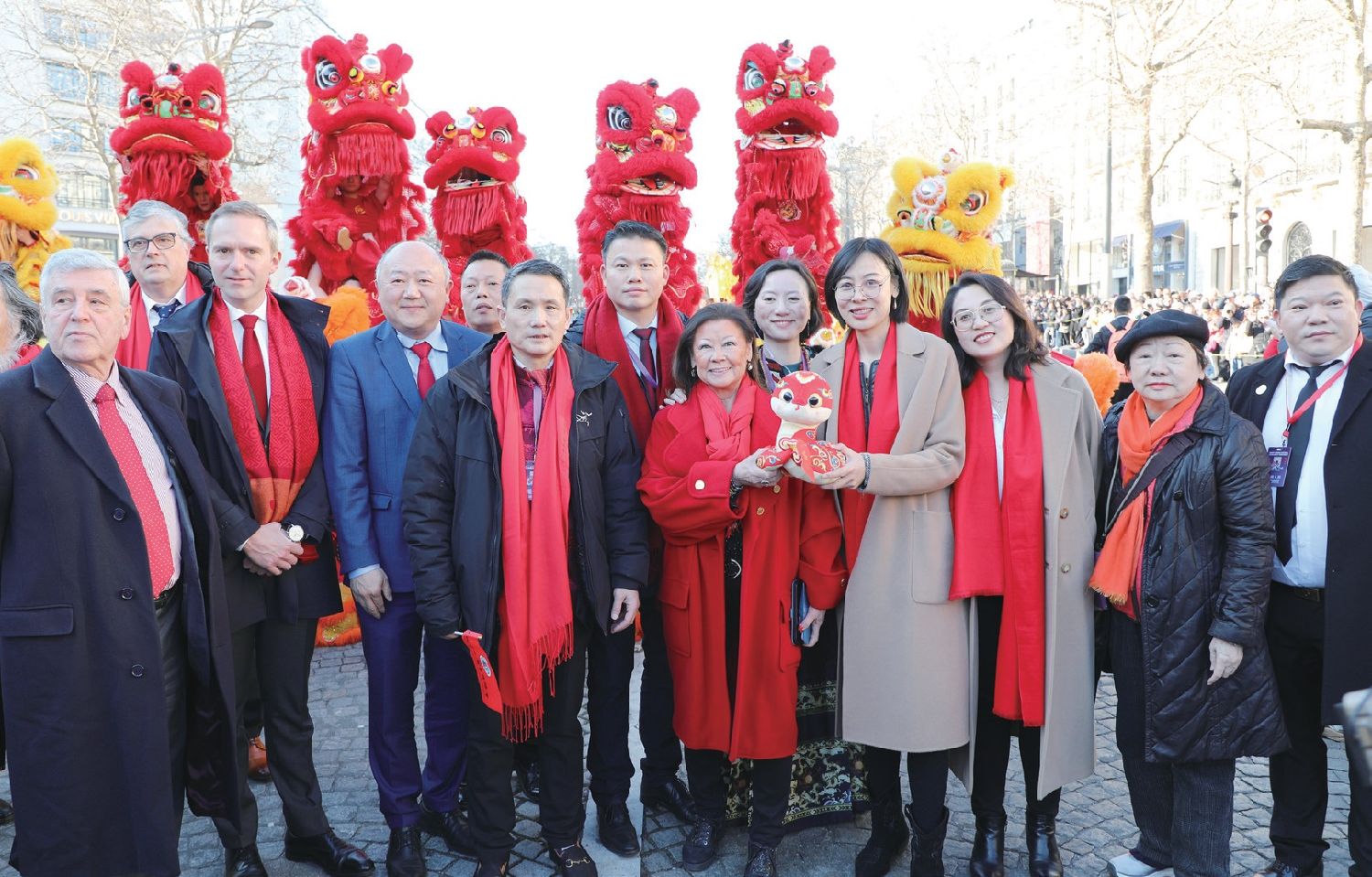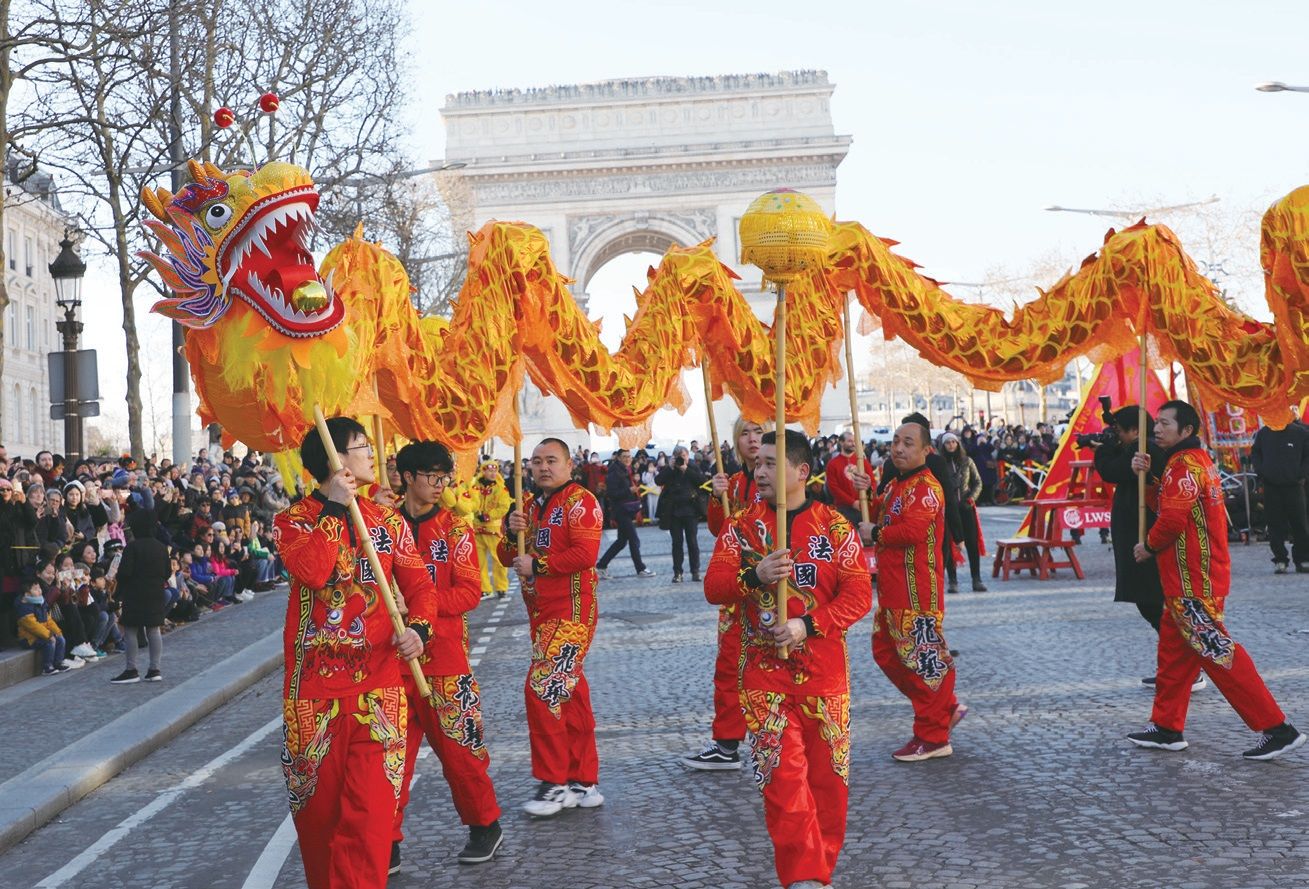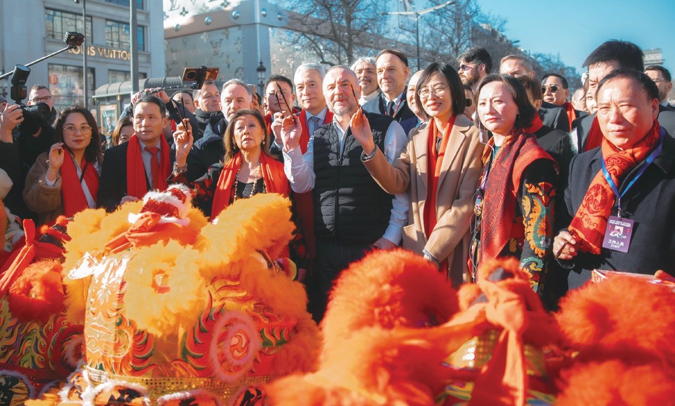 当天,在巴黎8区政府和巴黎警察局支持下,由法国巴赫瑞酒店集团、香榭丽舍大街商业委员会、中国驻巴黎旅游办事处、中国银行、广东省文化和旅游厅、法国华人贸易促进会等华人华侨社团,以及泊睿BORUI、Altervip唯璞集团和Paris Fantastic!等单位共同主办的第三届“欢乐春节满巴黎,龙狮贺岁舞香街”春节巡游活动在香街举行。法国国民议会议员格雷瓜尔(Emmanuel Grégoire),巴黎8区区长多特塞尔(Jeanne d'Hauteserre),香榭丽舍大街商业委员会主席、LVMH集团秘书长加麦(Marc-Antoine Jamet),中国驻法国大使馆文化参赞王茵、中国常驻联合国教科文组织代表团副代表王盈,参议员、马恩省议会主席布卢彦(Christian Bruyen),参议员莫尼埃(Marie-Pierre Monier)、兰斯市市长罗比奈(Arnaud Robinet)、佩皮尼昂市长阿里奥(Louis Aliot)、巴黎6区区长乐高克(Jean-Pierre Lecoq)、巴黎7区第一副区长高德(Josiane Gaude),法国前交通部长佩尔班(Dominique Perben)、法国前能源部长罗亚尔(Ségolène Royal)、法国前国务秘书勒甘(Jean-Marie Le Guen)、法国前国民议会议员陈文雄、芒塞尔(Jean-François Mancel),以及中国驻巴黎旅游办事处主任张郝淼,中国银行巴黎分行副行长方伟宇,巴赫瑞集团富凯酒店总经理卡尔丹(Julien Gardin)、亚洲销售总监杨晓静,法国华人贸易促进会会长林相伟等中法政商界代表、中法友好人士120人出席巡游主题午宴活动。