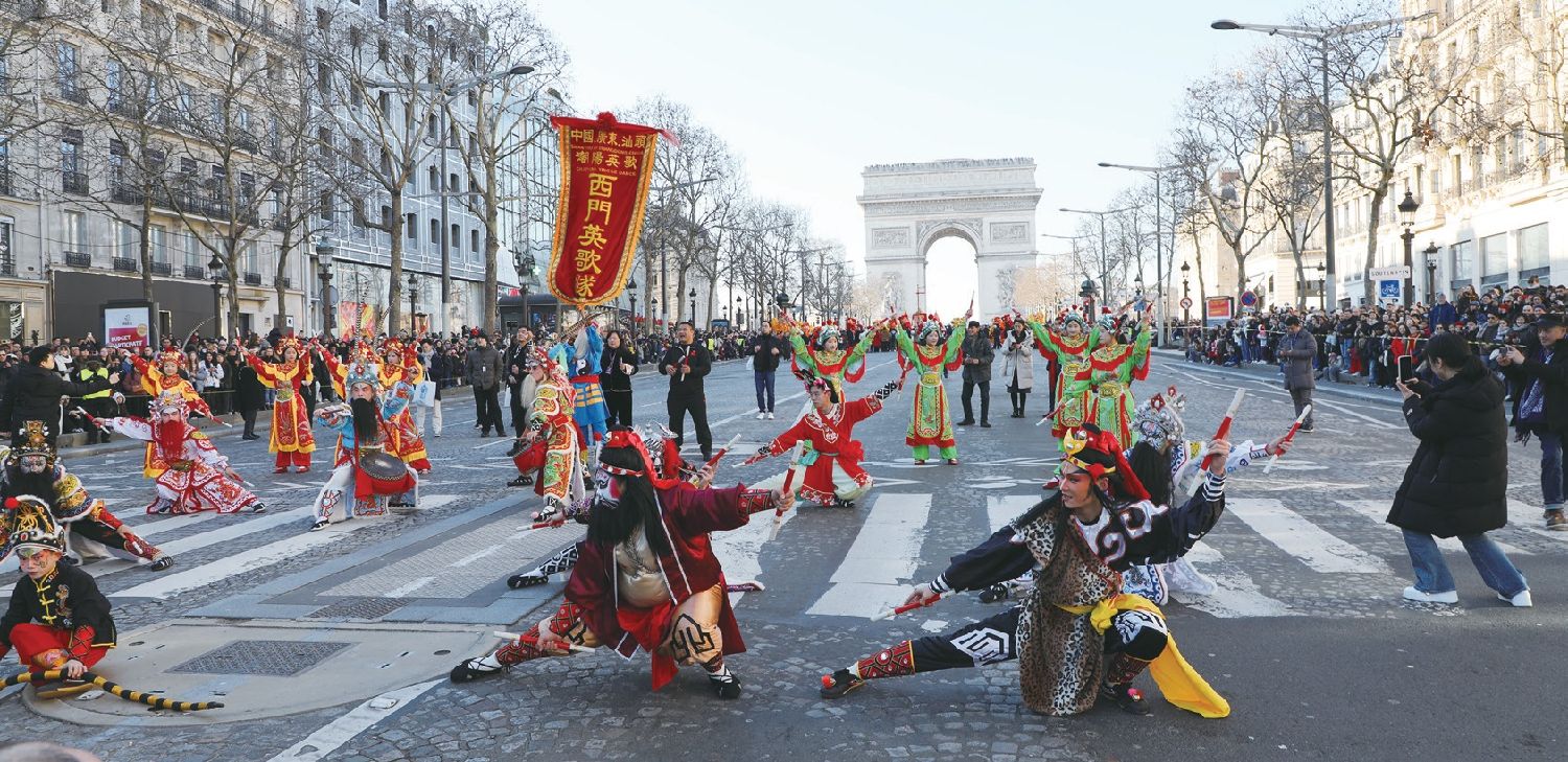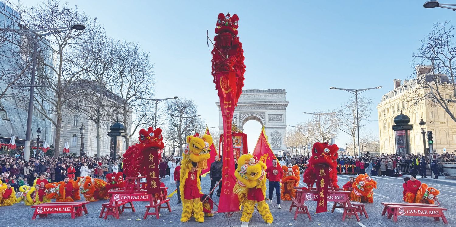 下午3点,随着中法嘉宾共同为醒狮点睛,由300人组成的香街巡游队伍开始逐一亮相,香街春节巡游正式拉开序幕。在4支由法国华人贸易促进会代表组成的舞龙团队的开道下,巡游队伍如长龙般浩浩荡荡地向前推进,鼓乐齐鸣、彩旗飘扬,热烈的节日氛围迅速在香街上空弥漫开来。龙身在阳光下熠熠生辉,象征着祥瑞与活力,瞬间点燃了现场观众的热情。凯旋门下,由佛山白眉拳馆巴黎分校南狮表演团队带来的精彩绝伦的高桩醒狮表演令观众大开眼界,其中“八仙木凳”“高竿跳跃”等高难度动作令人目不暇接,观众掌声与喝彩不断。南狮表演不仅展示了传统武术与舞狮文化的结合,更寓意着步步高升、好运连连的美好祝愿。