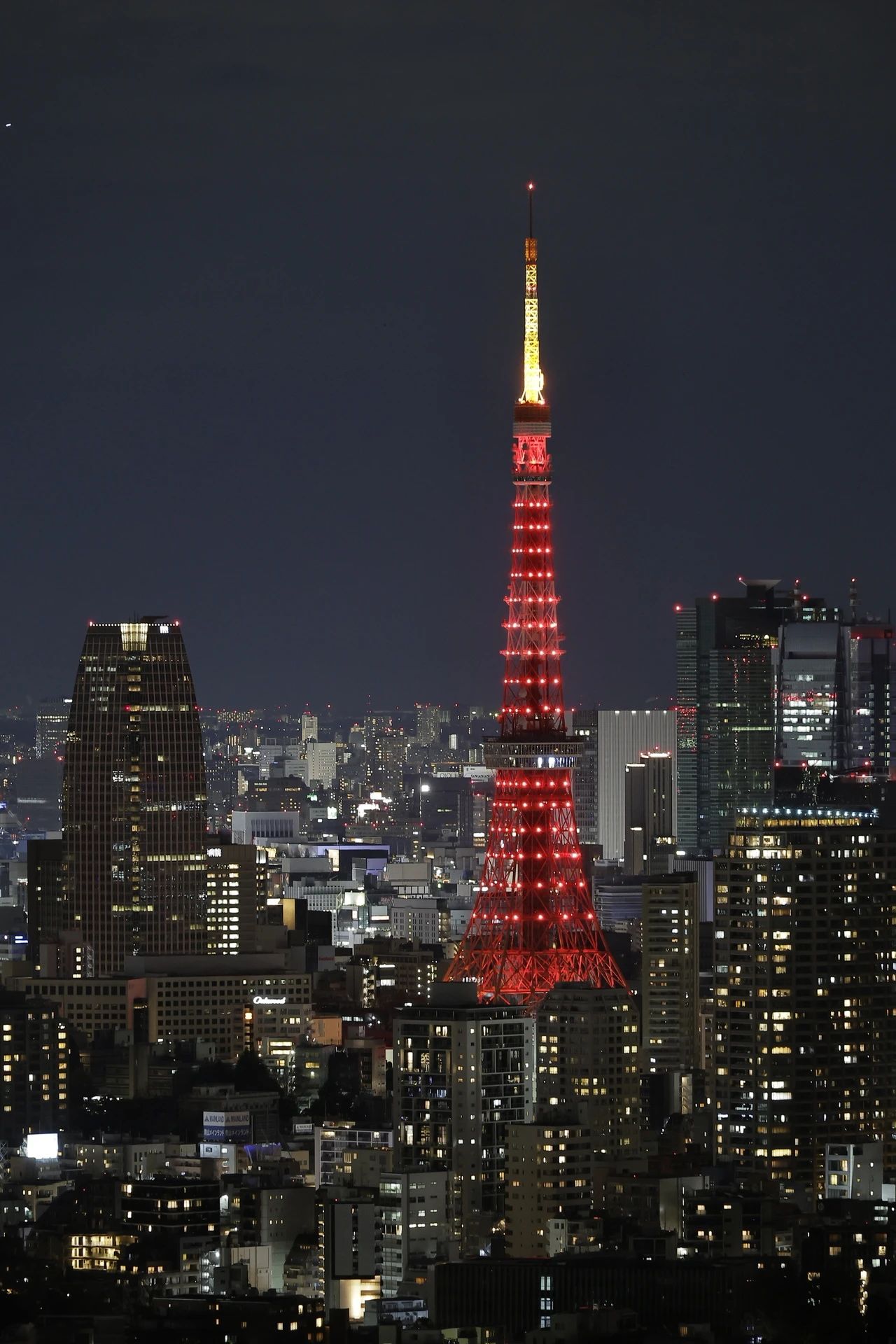 今年除夕夜,日本东京塔再度点亮“中国红”,红色灯光装扮的塔身与天际线交相辉映,塔身显示“迎春”字样,送上蛇年新春祝福。