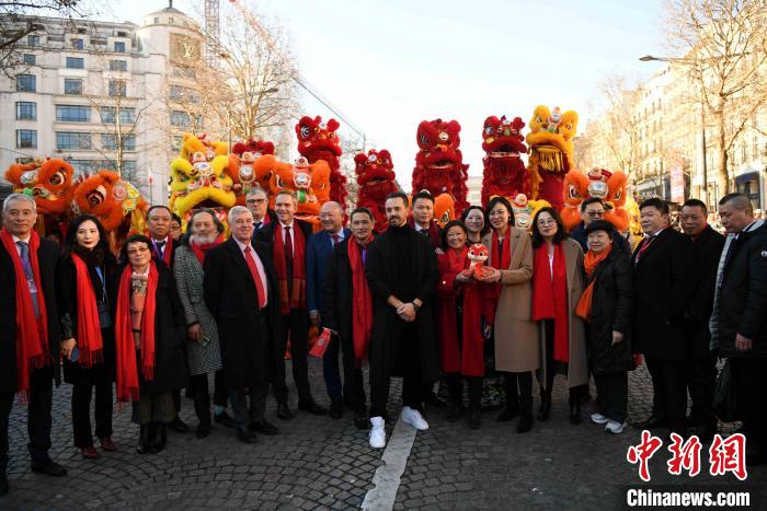 2月2日,第三届“欢乐春节满巴黎,龙狮贺岁舞香街”春节巡游活动在巴黎香榭丽舍大街举行。图为出席活动的部分中法嘉宾合影。(图片来源:本文图片均来自中新网)