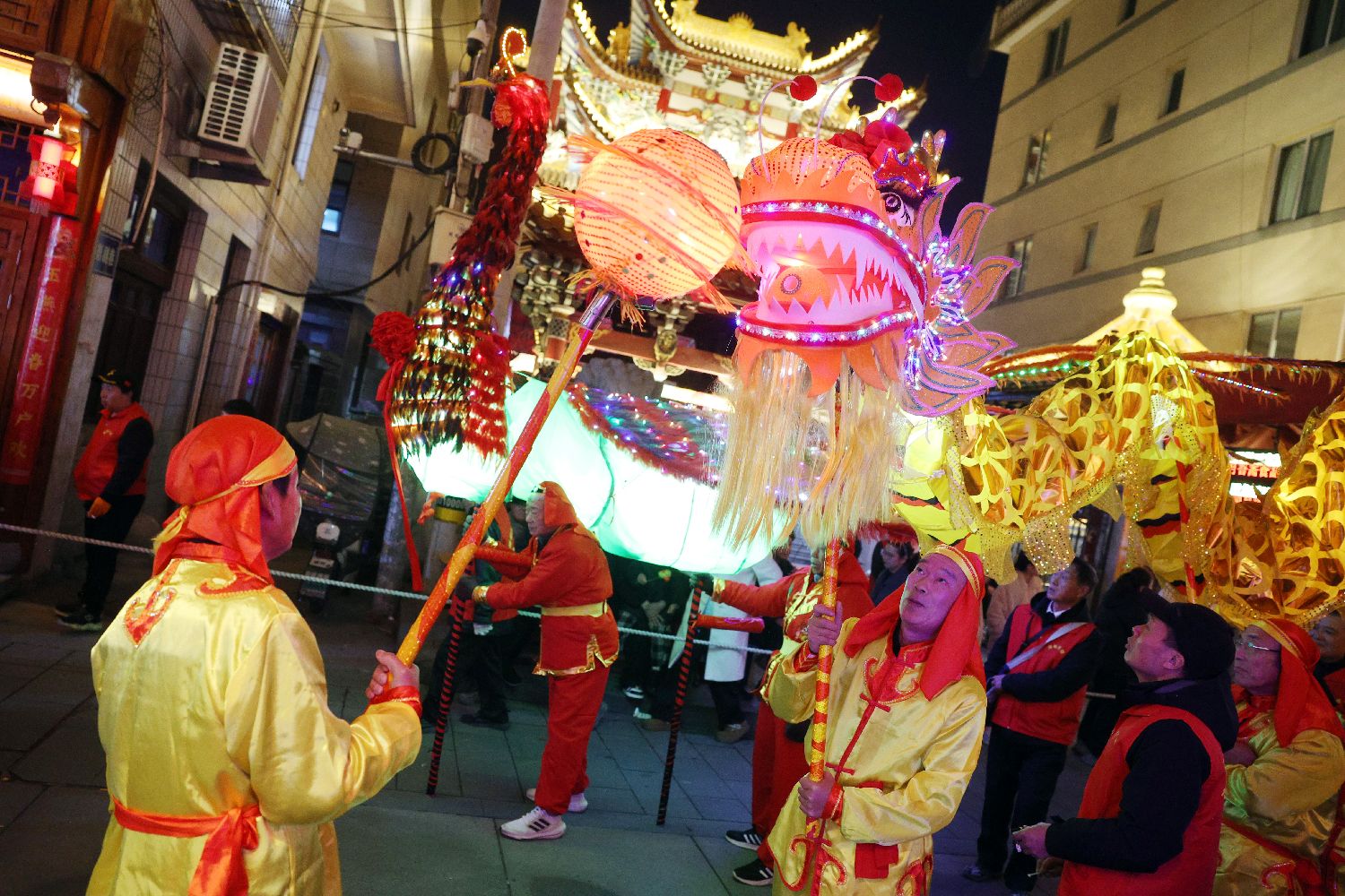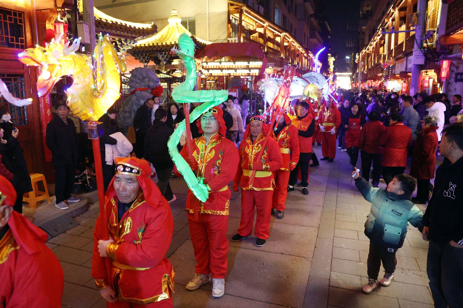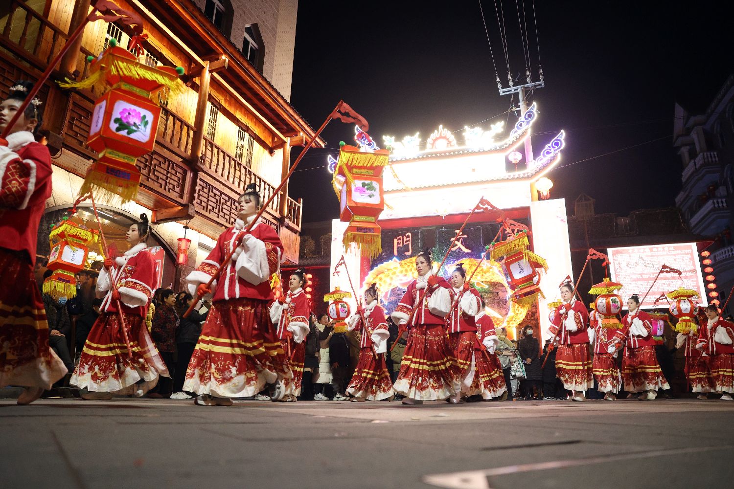 蒲岐古镇创建于南宋孝宗年间,至今已有800多年的历史,镇内保存有保泰门、蔚文门、定安门和镇武门四座古城门。近年来,蒲岐古镇充分利用“四城门”以及省级历史文化名镇的独特优势,依托丰富的古镇文化、海防文化等资源,融合历史、饮食、非遗和民俗等多元文化,逐步发展成一个人气集聚、文韵深厚、环境优美的文化旅游胜地。图为2月3日,百余米的花灯行进队伍在温州蒲岐古镇内巡游。(图片来源:本文图片均由李大鹏摄)