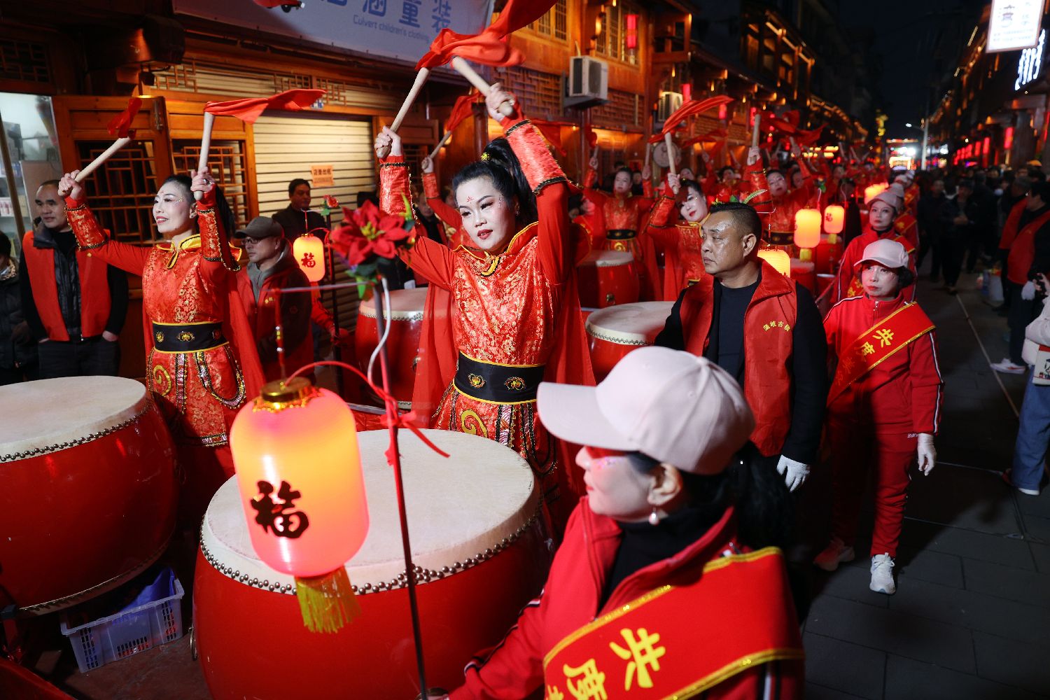 图为2月3日,由当地居民组成的鼓队为花灯巡游队伍开路。