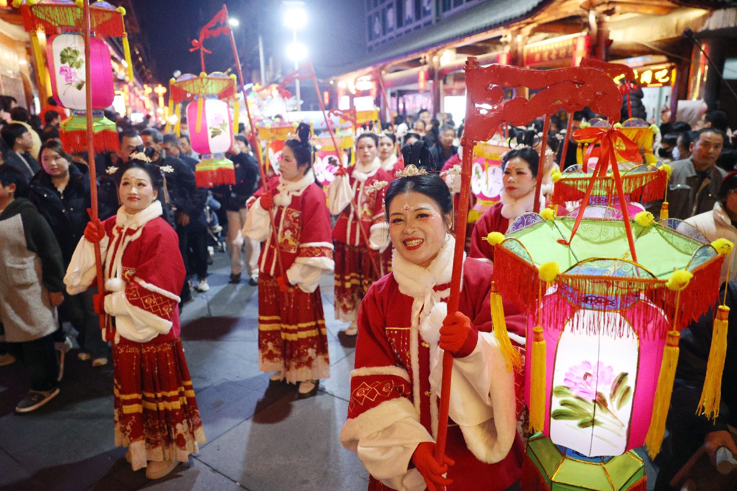 2月3日,温州蒲岐古镇举行了盛大的花灯巡游活动,当地居民精心制作了各式各样的花灯,灯组形态各异,既有动物、植物、人物等传统造型,也有富有地方特色的民俗元素。整场巡游由当地居民和表演团队共同参与,大家身着节日盛装,随着花灯的点亮,沿途有传统花灯展示,还有腰鼓舞等富有特色的民俗表演。