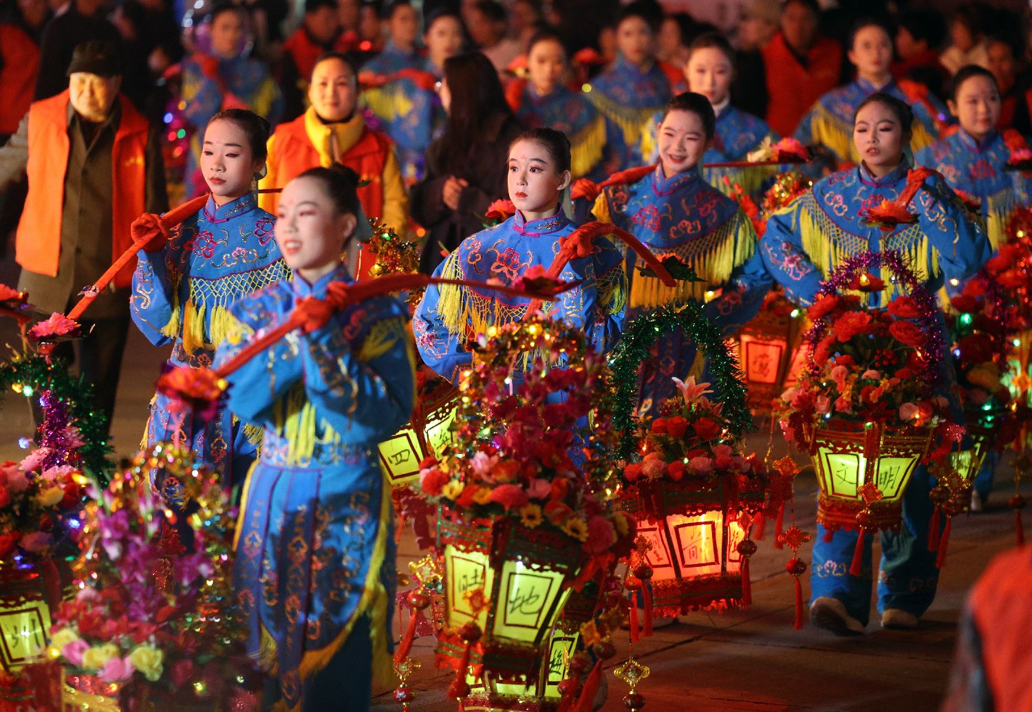 图为2月3日,表演者挑着花灯在队伍中巡游。
