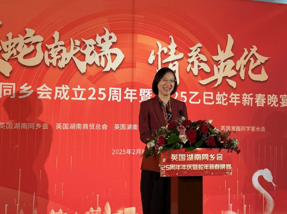 中国驻英国大使馆公参兼总领事江雷出席晚宴并致辞。她表示,英国湖南同乡会不仅是湖南籍同胞在英的温暖家园,也是推动中英文化交流的重要平台。希望同乡会继续发挥桥梁和纽带作用,为推进中英友好关系作出更大贡献。