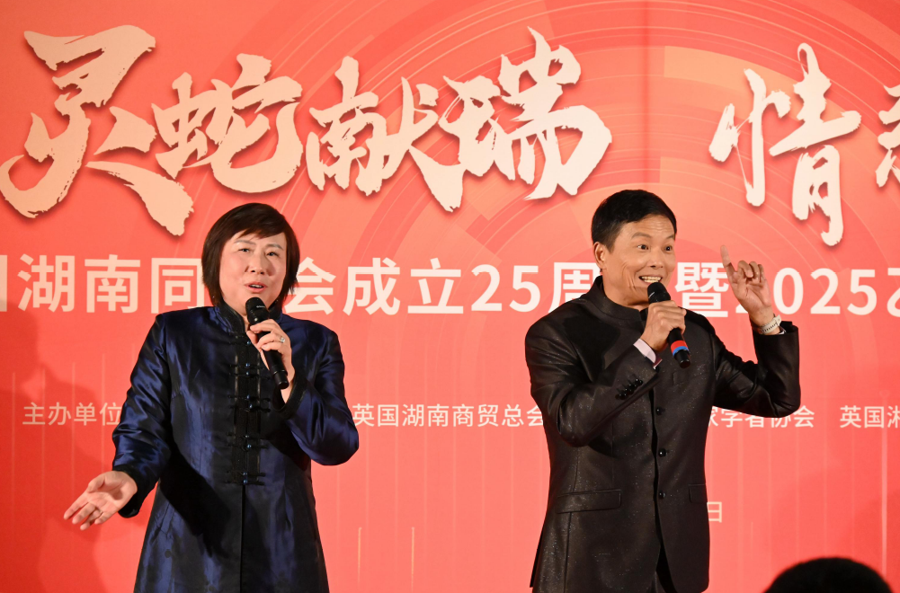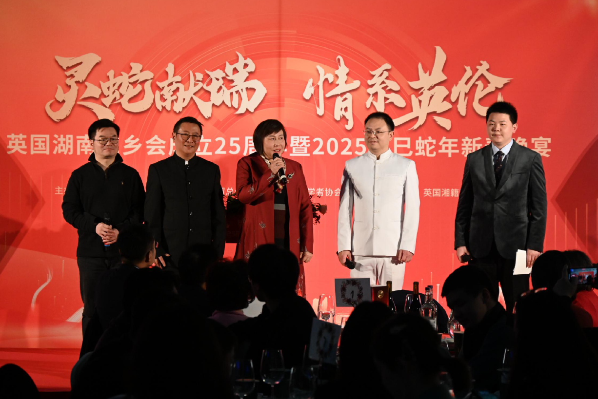 【欧洲时报记者余梁意、实习记者胡玉茜报道】2月8日晚上6时,英国湖南同乡会成立25周年暨2025“金蛇迎春”新春晚宴在伦敦皇庭(Bright Courtyard Club)举办。本次活动由英国湖南同乡会、英国湖南商贸总会、英国湖南专家学者协会、英国湘籍同学会以及英国湘籍同学家长会联合主办,吸引了来自英国各地的湖南籍乡亲、华侨华人代表、英国各界友好人士共190余人参加。