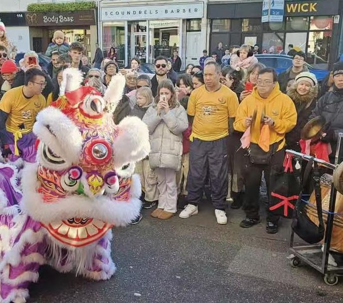 随后,狮队继续前行,沿着美食街为各 商家拜年,并进入布莱顿市中心,为当地华 人商铺送上新春祝福。巡游过程中,市民们 纷纷驻足观看,欢呼声不断,甚至有车辆停 下欣赏表演。英国布莱顿及豪富市华协会还 特别准备了红包、蛇年挂饰、糖果和巧克力 金币,分发给沿途观众,分享新春的喜悦。
