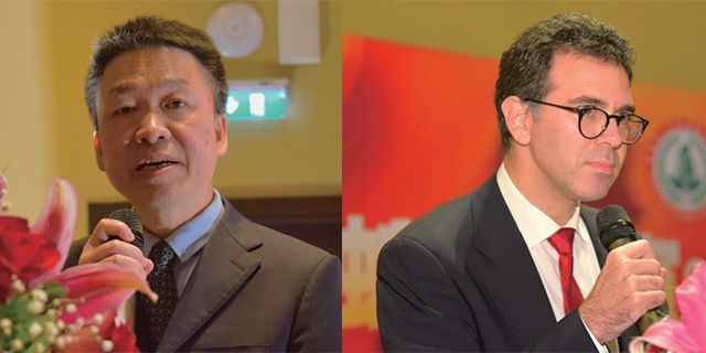 左图为希腊华人华侨福建联合总会会长陈锋致辞。右图为希中经济合作商会名誉主席Fotis Provatas致辞。