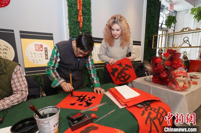 当地时间2月15日,加拿大多伦多,当地华人文化机构国风馆与伊朗文化艺术中心共同主办“丝路芳华——中伊新春盛典”,共庆中国新年。图为华人书法家为伊朗裔与会者书写挥春。