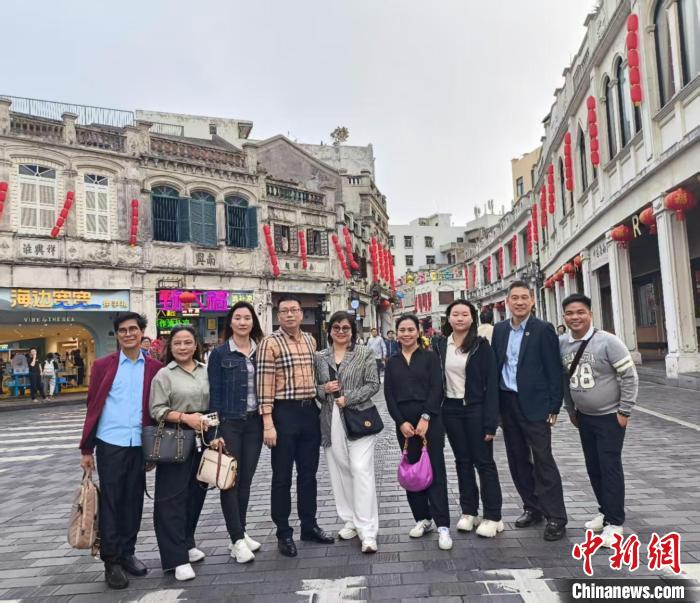 2月18日,由旅菲华侨工商联总会荣誉会长许自福率领的菲律宾比尼扬市、新加坡教育机构代表一行走进海口中山路骑楼老街。(图片来源:本文图片均来自中新网)