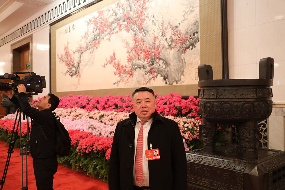 图为政协海外侨胞列席代表、法国华侨华人会主席蔡君柱在人民大会堂接受记者采访。(图片来源:欧洲时报特派记者黄冠杰 摄)