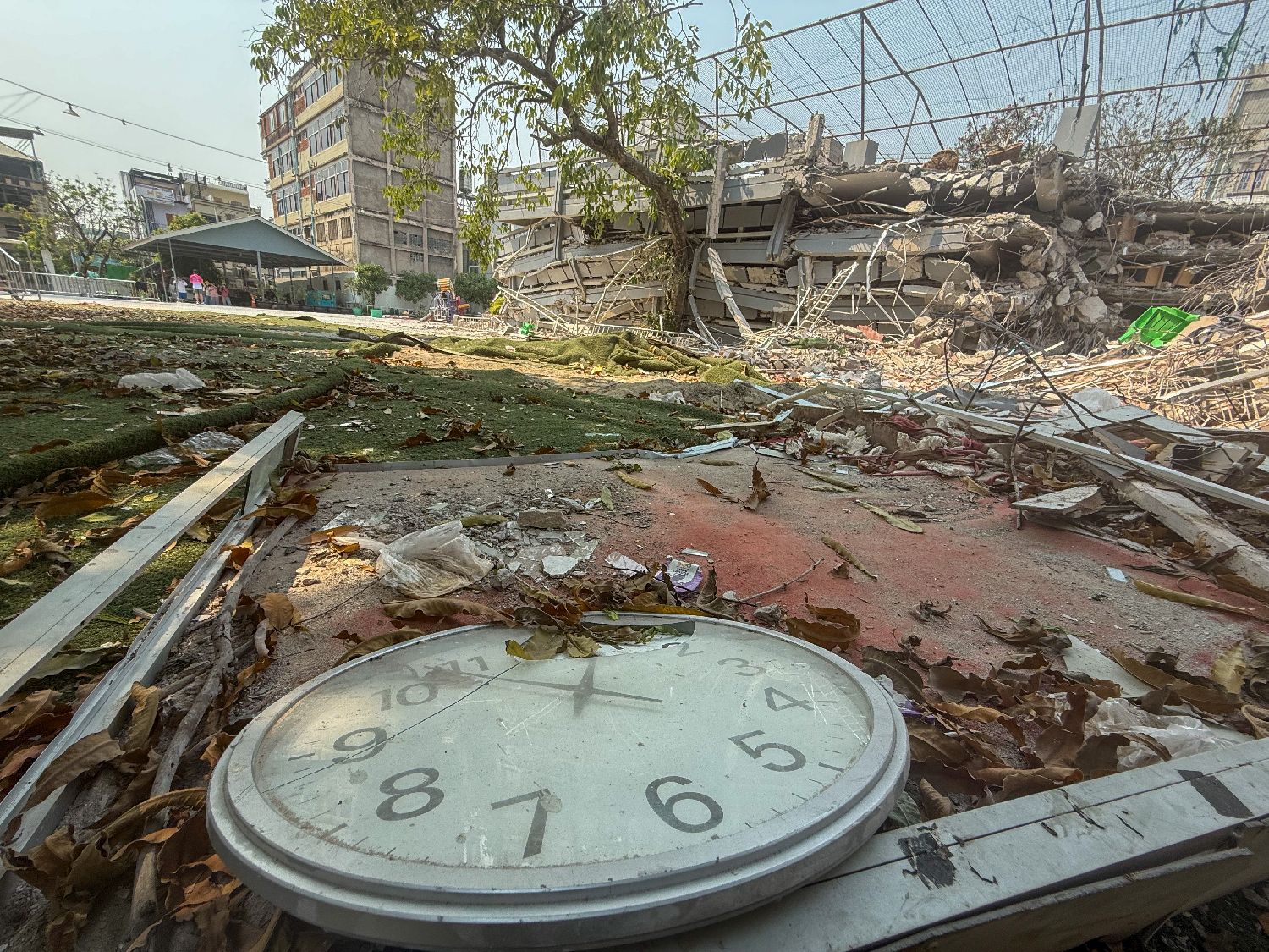 2日,因地震造成教学楼坍塌的缅甸曼德勒孔教学校北校区现场,一台时钟“躺”在废墟中,时间定格在地震发生的一刻。(图片来源:中新社)