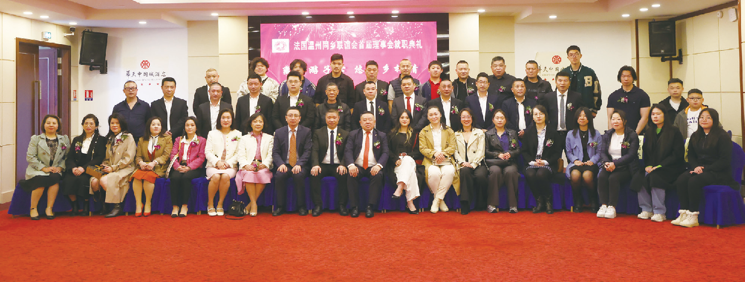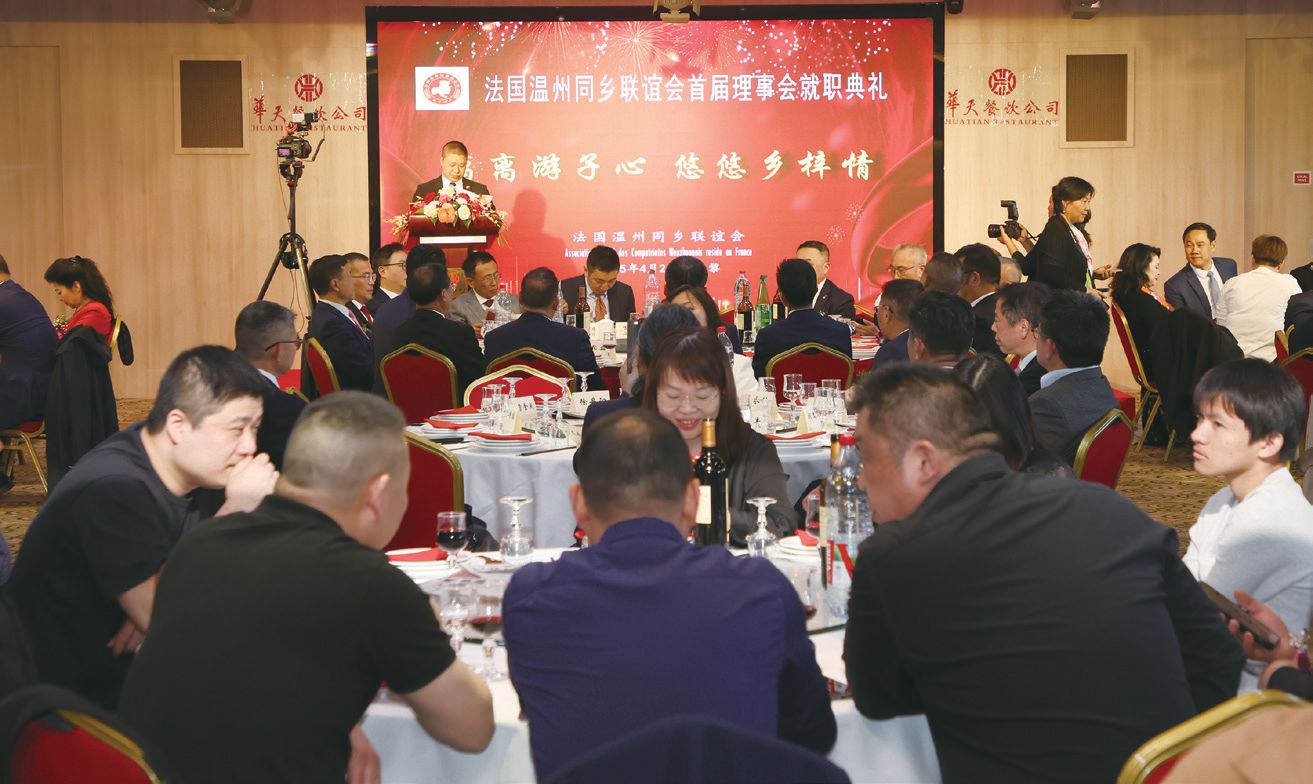 【欧洲时报记者马行健巴黎报道】当地时间4月20日晚,法国温州同乡联谊会首届理事会就职典礼在巴黎华天中国城大酒店举行,郑祥真出任协会首届会长。中国驻法国大使馆领侨处主任万磊参赞、秘书白鸽,法国华侨华人会主席蔡君柱,法国青田同乡会会长周伟以及旅法侨界二百余名嘉宾到场祝贺。欧洲时报文化传媒集团总裁、《欧洲时报》社社长钟诚出席活动。