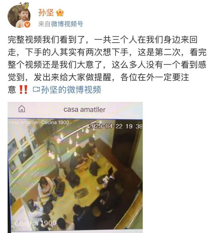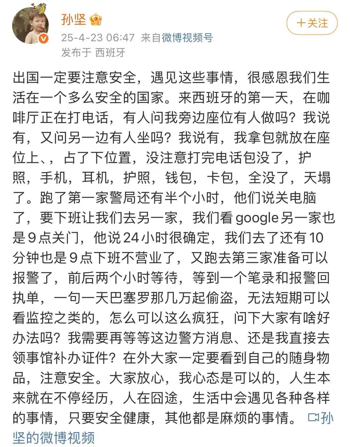 据孙坚本人通过社交媒体披露,此次盗窃事件发生在他抵达西班牙巴塞罗那的首日。一行人于当地时间下午前往市中心某咖啡厅短暂停留,他因接电话短暂离座,背包留在椅上。其间,两名陌生男子上前搭话,借询问“是否有人坐这里”分散注意,实则联手实施盗窃。当孙坚回到座位时,背包已不翼而飞,内含护照、手机、现金等贵重物品尽数丢失。