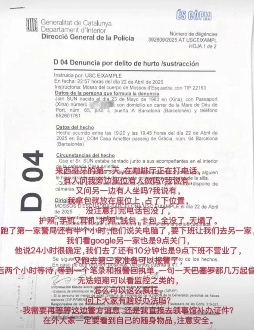 面对接连被盗的窘境,孙坚辗转三家警局报案,却连续遭遇“系统关闭”“不在受理时间段”等理由推诿,直到第三处警局才得以完成笔录。而当地警方坦言,“巴塞罗那每天都有成千上万起盗窃,很多案件短期内难以追查”,这无疑揭示出这座旅游胜地治安管理的现实困境。