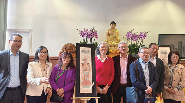 旅英青年艺术家夏域(左二)的佛画艺术展“域见·遇见”在伦敦佛光山开幕,出席嘉宾合影。