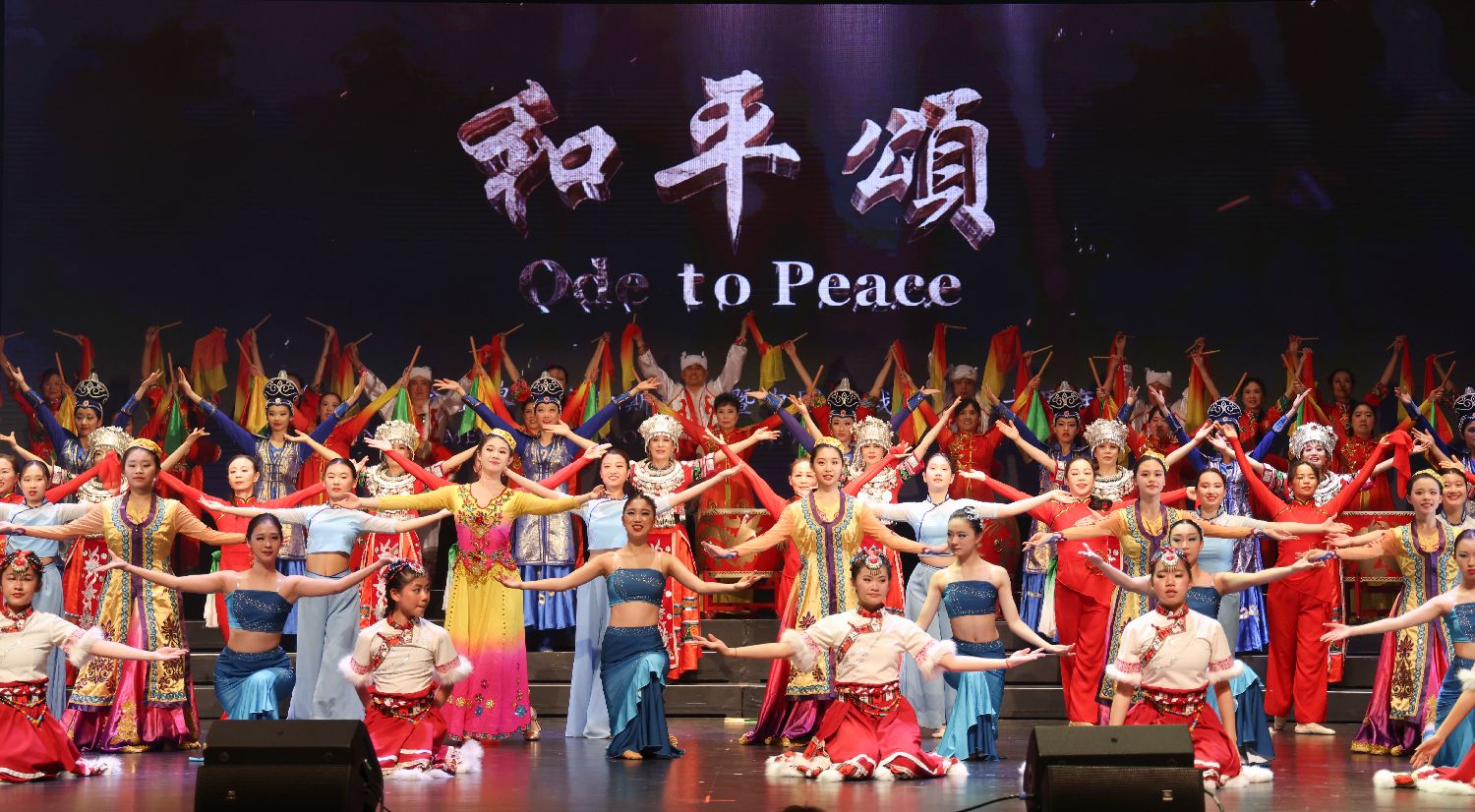 当地时间5月18日晚,加拿大华人团体携手呈现的大型音乐舞蹈史诗《和平颂》在大多伦多地区密西沙加市上演,以纪念世界反法西斯战争暨中国人民抗日战争胜利80周年。图为终曲舞蹈《欢庆》。(图片来源:中新社)