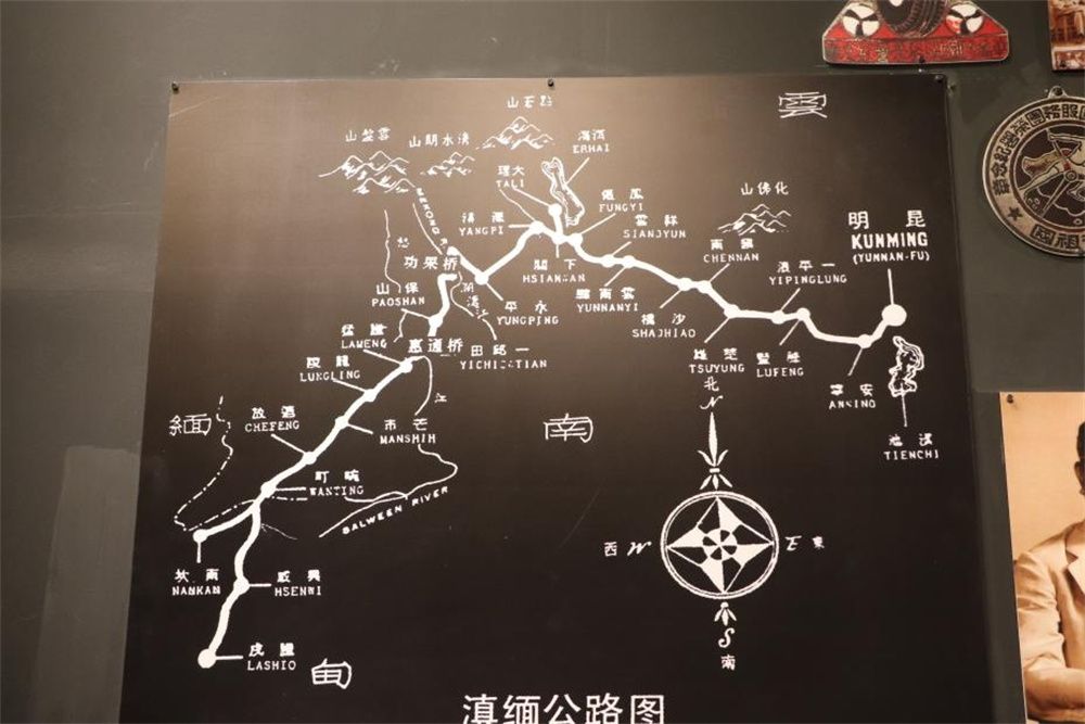 中新社报道,展区最为醒目的,是展墙上一幅从缅甸腊戍蜿蜒北上抵达昆明的“滇缅公路图”。1937年,中国人民抗日战争全面爆发后,中国沿海港口尽数沦陷。20万滇西民众用钢钎凿穿碧罗雪山、高黎贡山等多座天险,3000余人殒命筑路现场,在9个月内打通了这条全长1146公里的抗战物资运输生命线。