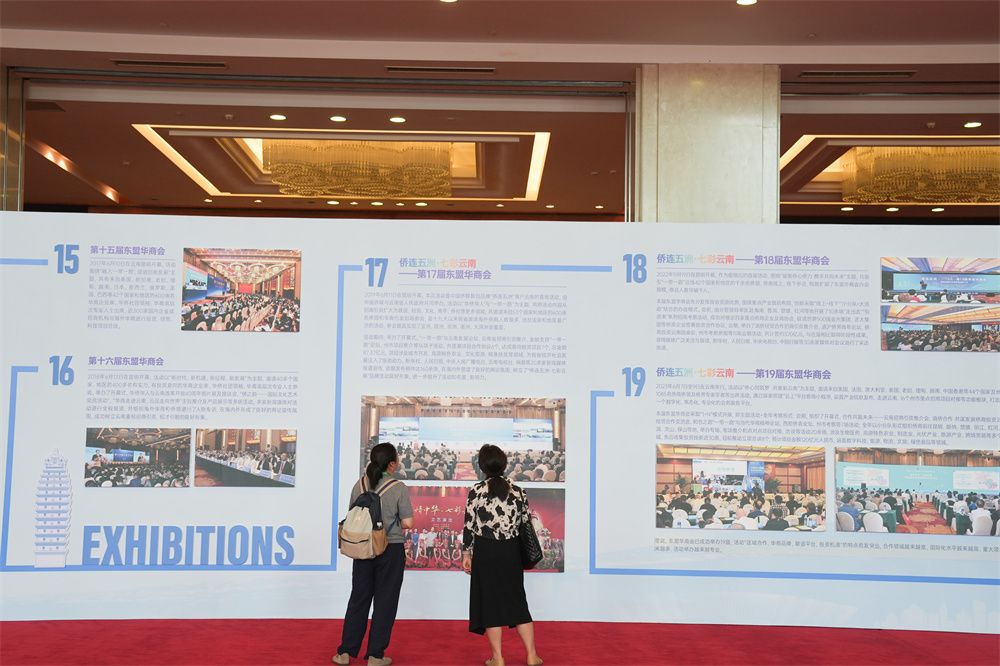 图为2024年6月“侨连五洲·七彩云南”——第20届东盟华商会举办期间,嘉宾观看东盟华商会20周年主题成就展。(图片来源:中新社)