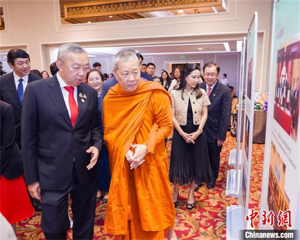 6月8日,泰国副僧王颂德通猜(前右)和泰国教育部部长蓬普(前左)参观海上丝路孔子学院的教育成果展。(图片来源:海上丝路孔子学院供中新网)