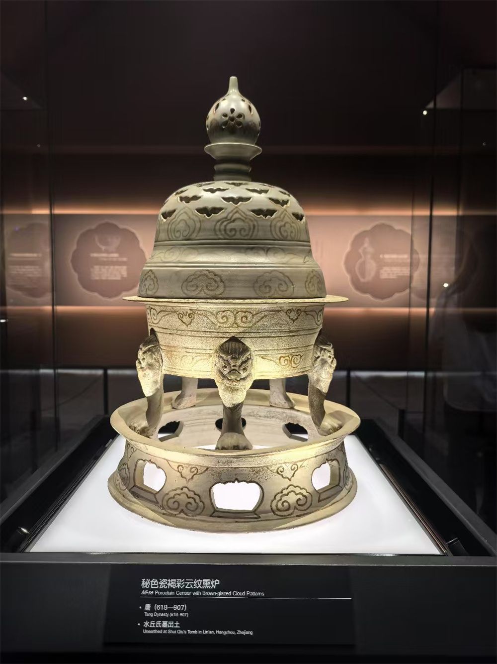 吴越文化博物馆的众多珍贵文物中,有三件于二楼特设厅中厅展示。这三件文物分别是秘色瓷褐彩云纹熏炉、秘色瓷褐彩云纹盖罂和秘色瓷褐彩云纹油灯,均出土于吴越国王钱镠生母水丘氏墓,是晚唐秘色彩绘瓷的典范之作。全浙江省目前共有18件,这里就占了3件,熏炉还是被列为禁止出国(境)展出的195件文物之一,极其珍贵。