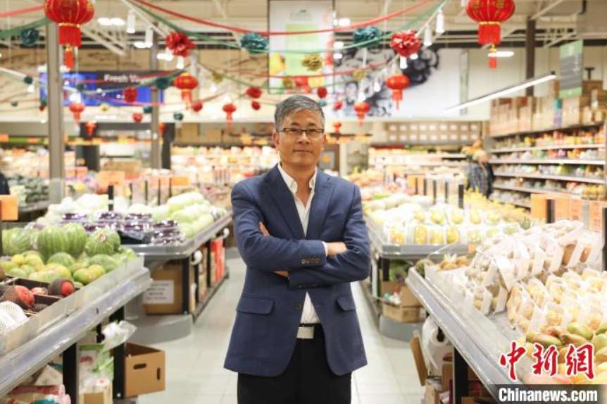 图为2025年5月21日,加拿大闽籍华商林庆清在其公司旗下位于安大略省贵湖市(Guelph)的一间超市内。(图片来源:中新网)