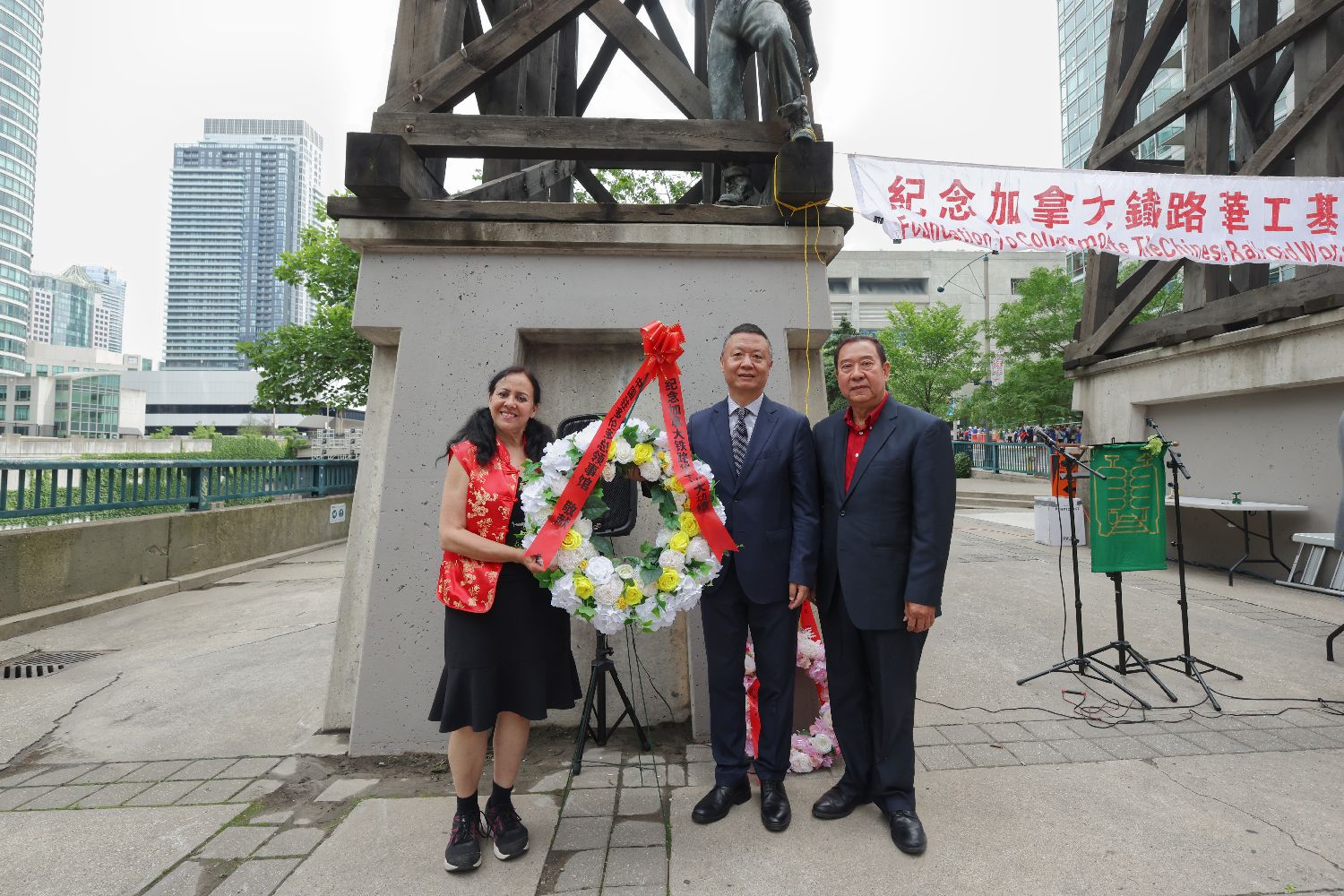 当地时间7月1日,在加拿大多伦多,中国驻多伦多总领事罗伟东(中)在太平洋铁路华工纪念活动中代表总领馆向铁路华工纪念碑敬献花圈,其身旁为纪念加拿大铁路华工基金会主席吴玉美(左)、副主席胡龙杰。加政界、相关机构及当地侨界和各族裔民众等约百人参加活动。纪念加拿大铁路华工基金会每年7月1日、即加拿大国庆日主办铁路华工纪念活动。2025年适逢加拿大太平洋铁路建成140周年。(图片来源:本文图片均自中新社)