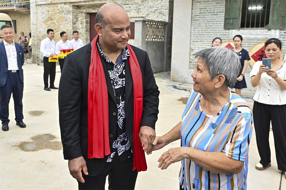 7月8日,广东江门,瑙鲁总统戴维·阿迪昂与他的堂外祖母谭惠霞在交流。(图片来源:中新社)