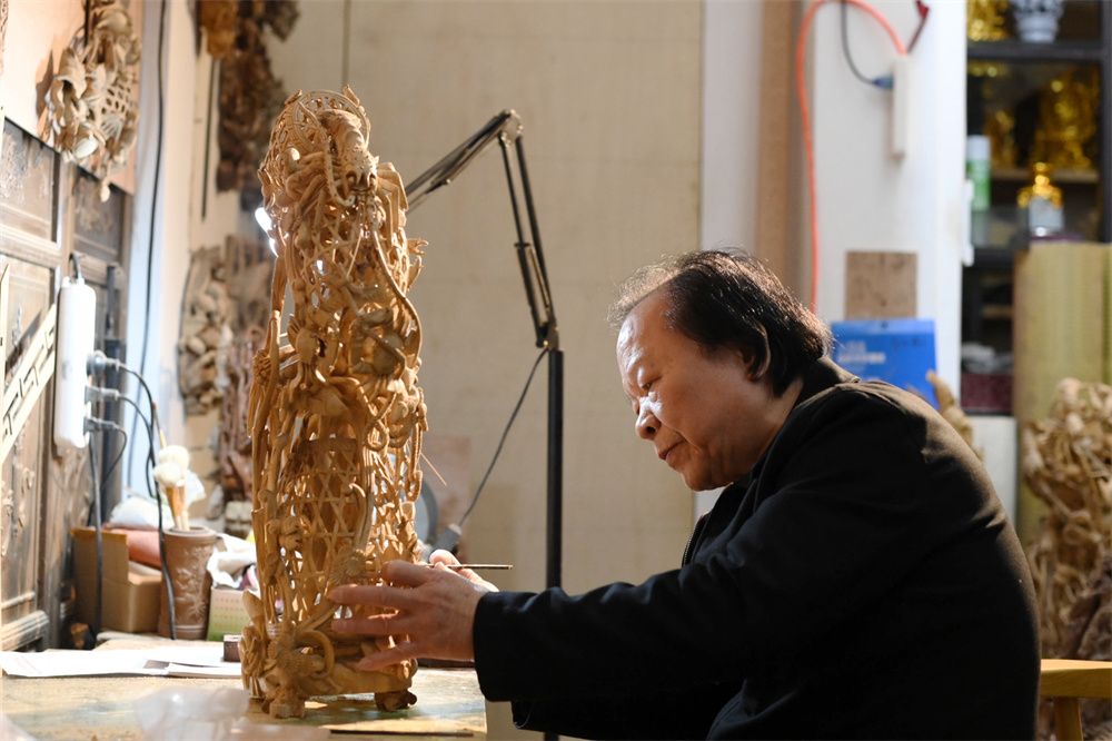 潮州木雕手艺人也各显神通。今年6月,广东省高级工艺美术师陈标楠和内地知名家居企业合作,将木雕技艺融入高端手作木质家具;“Z世代”郭奕辉创作了“哪吒”主题的木雕作品,还常和父亲郭少俊一起,举办潮州木雕研学活动。